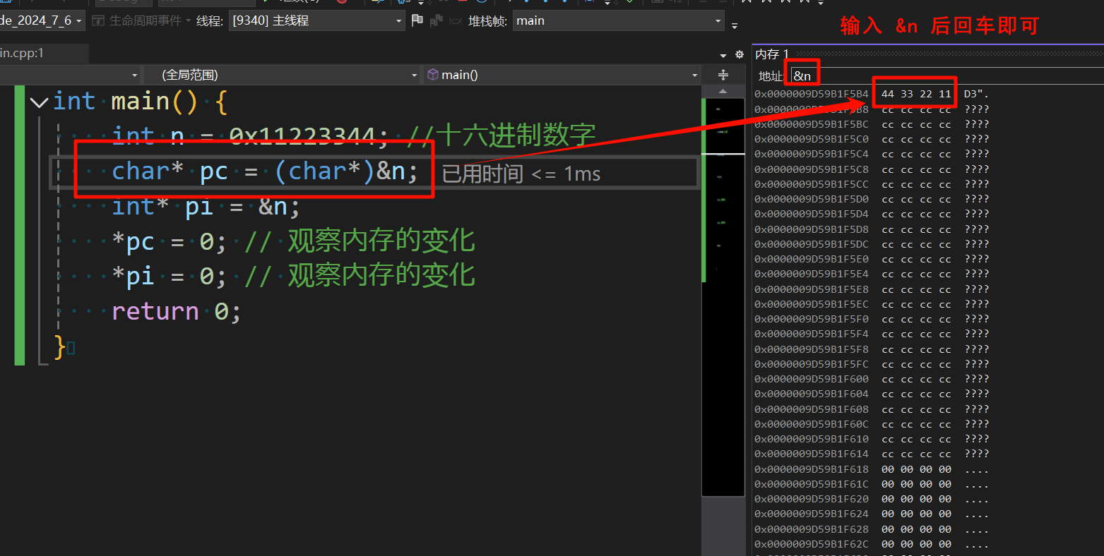 char* pc = (char*)&n; // 将 int *类型的指针强制转化为 char* 类型
