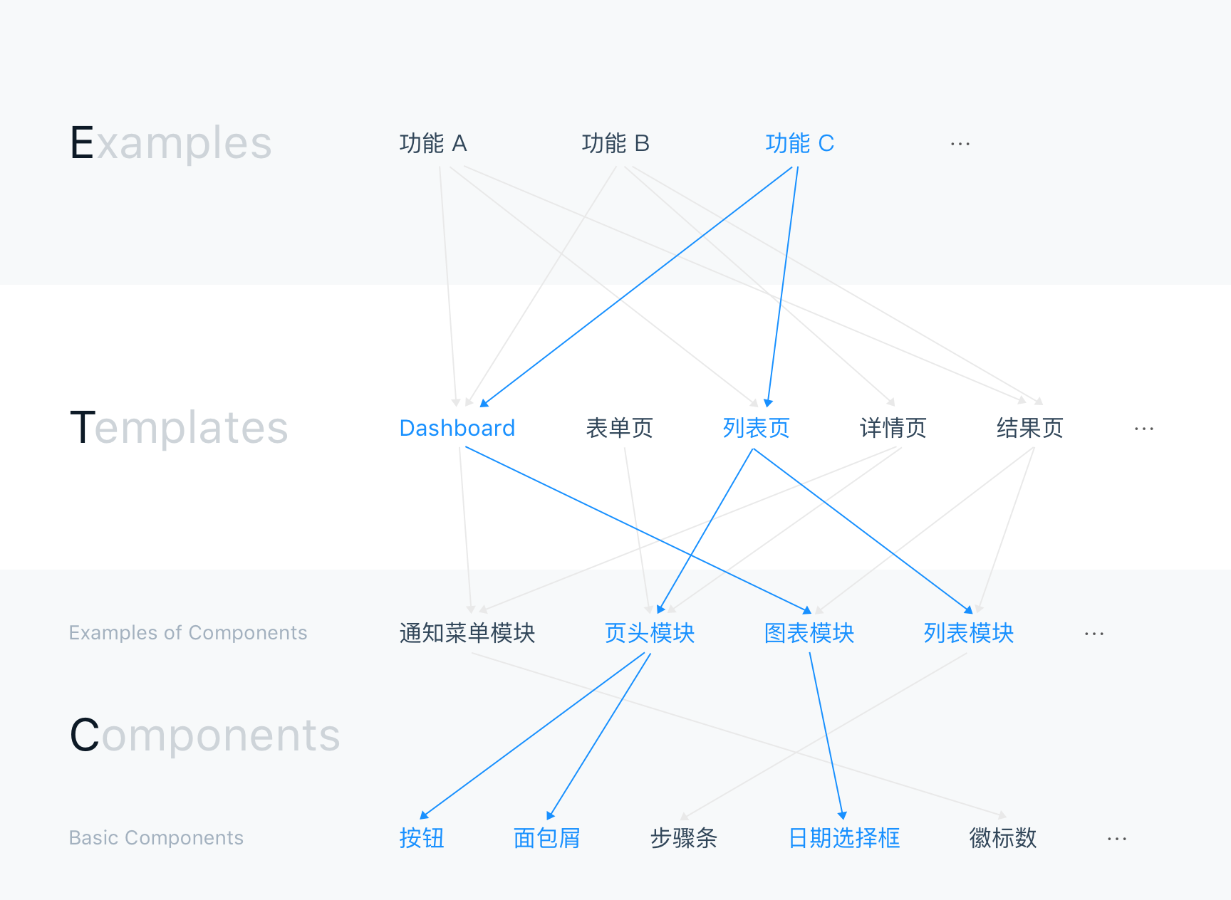 - 模板:一个页面级示例,启发用户如何在系统中构建典型页面,例如详细信息页面