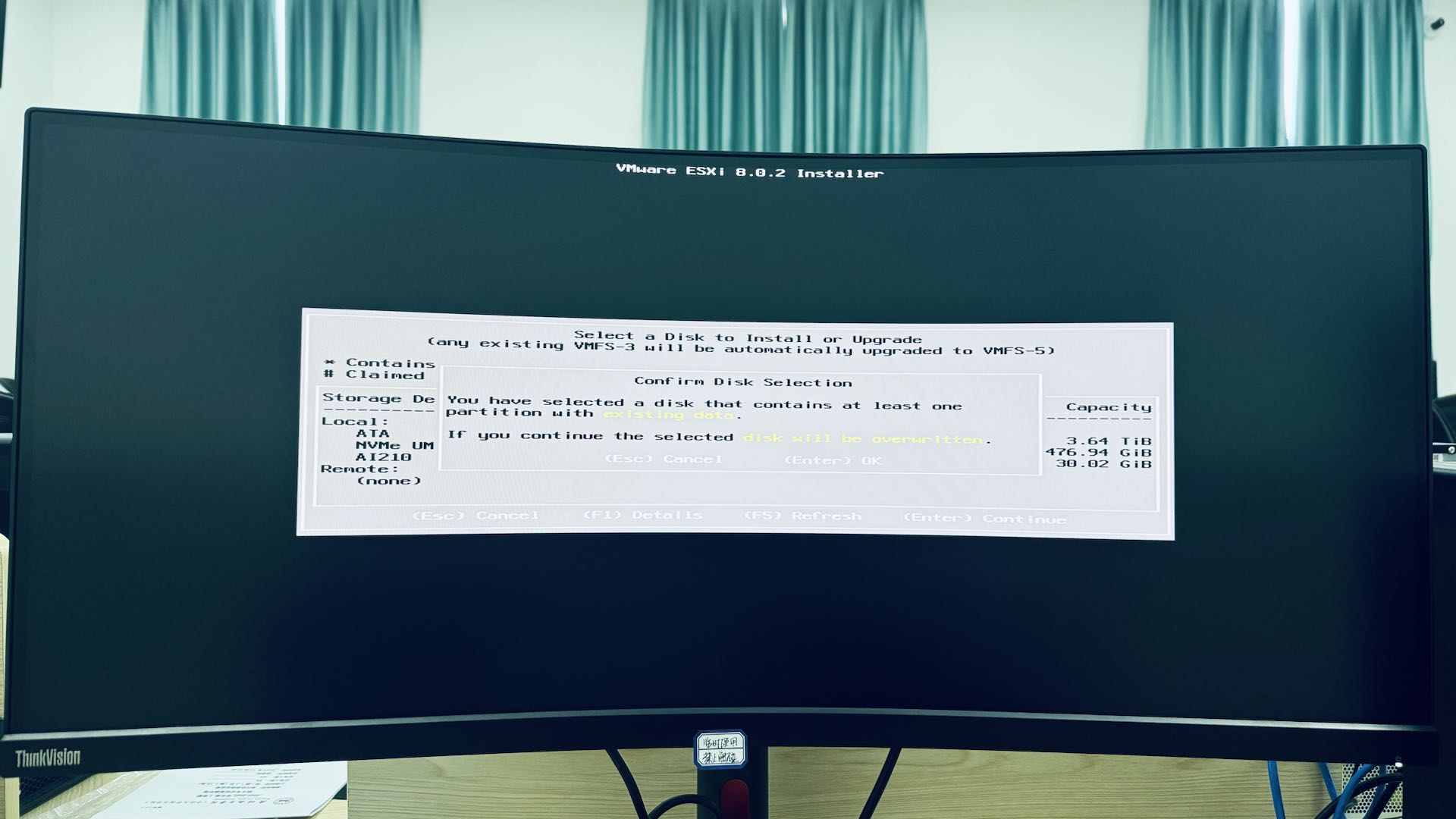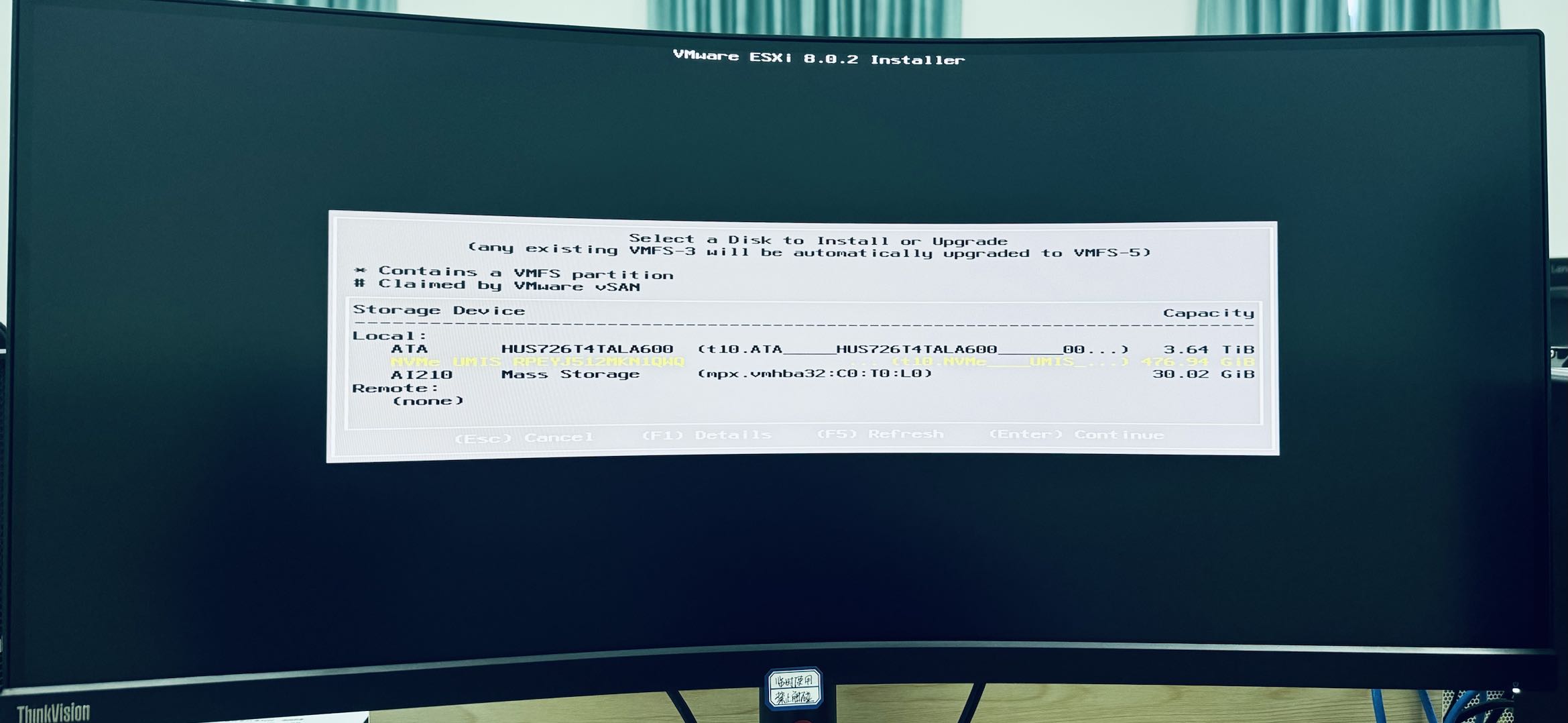 使用方向盘选择一个磁盘作为 ESXi 的系统盘(注意这个盘会被 ESXi 全部占有,数据会被全部清空),按下 [enter] 确认即可(另外一个作为 ESXi 后续的数据盘)。